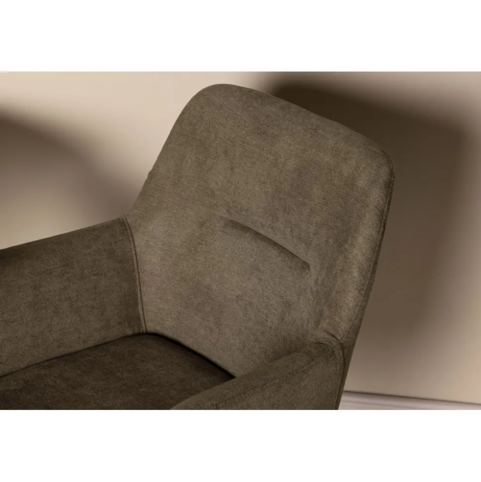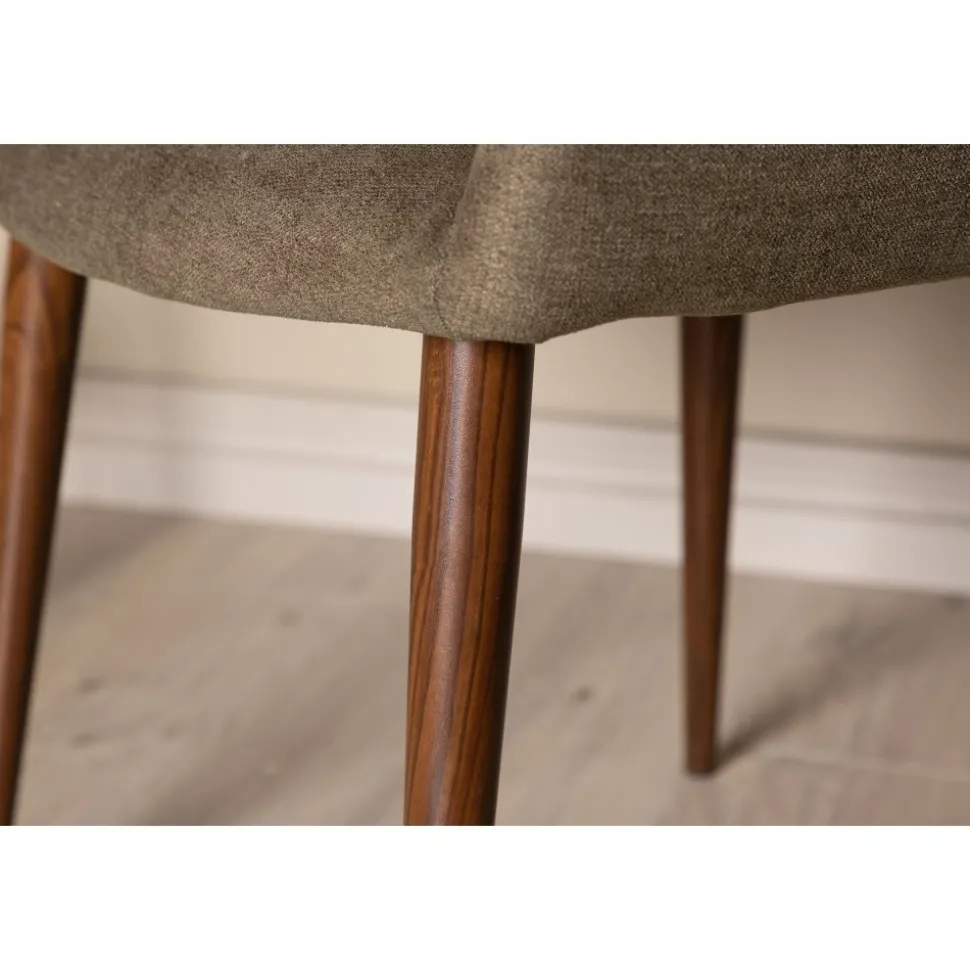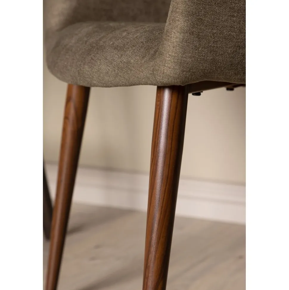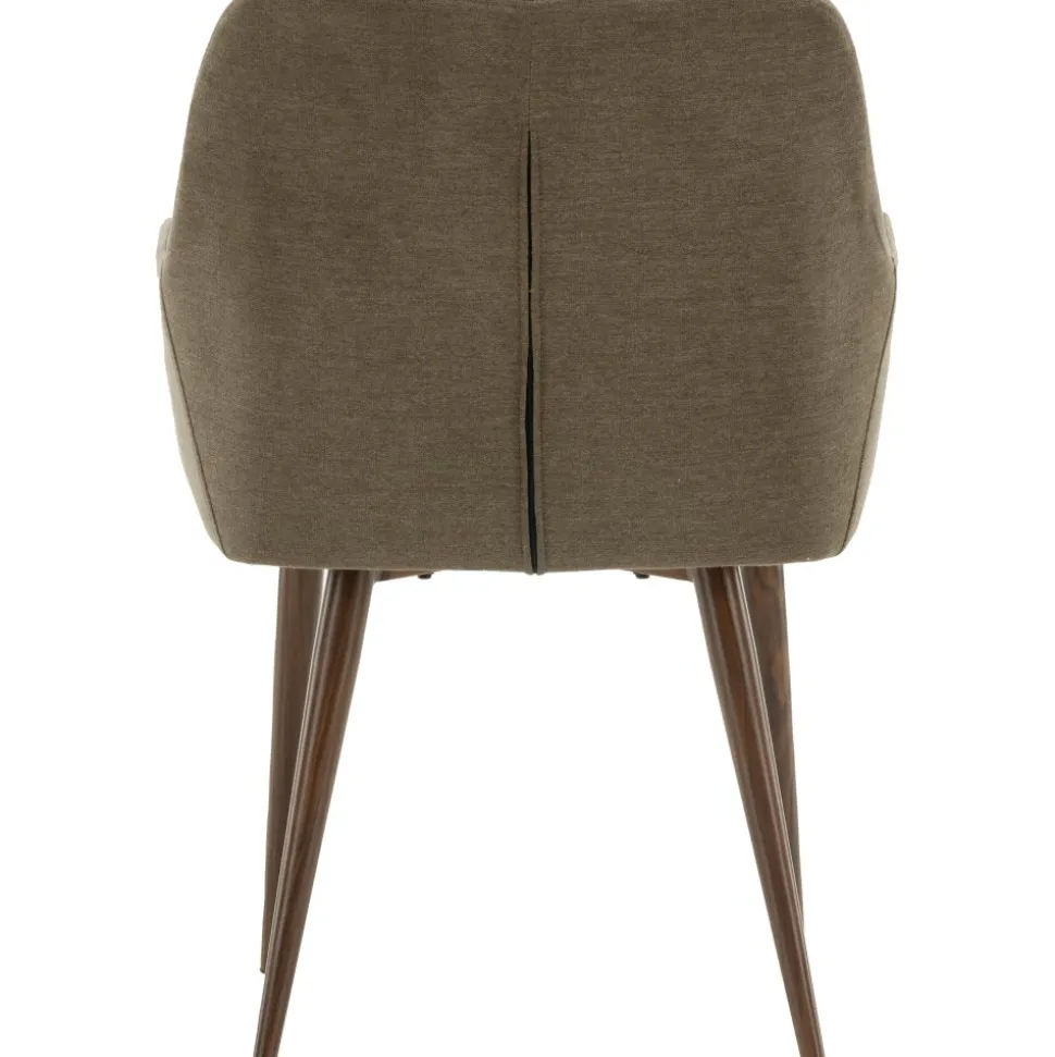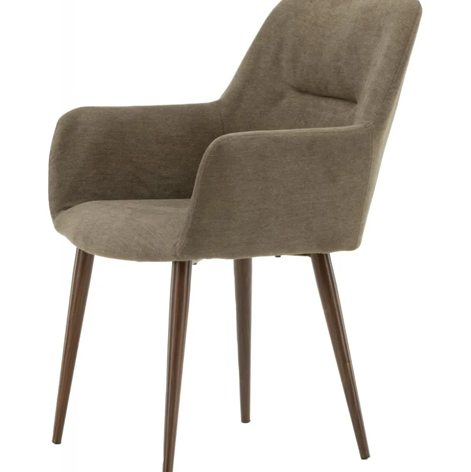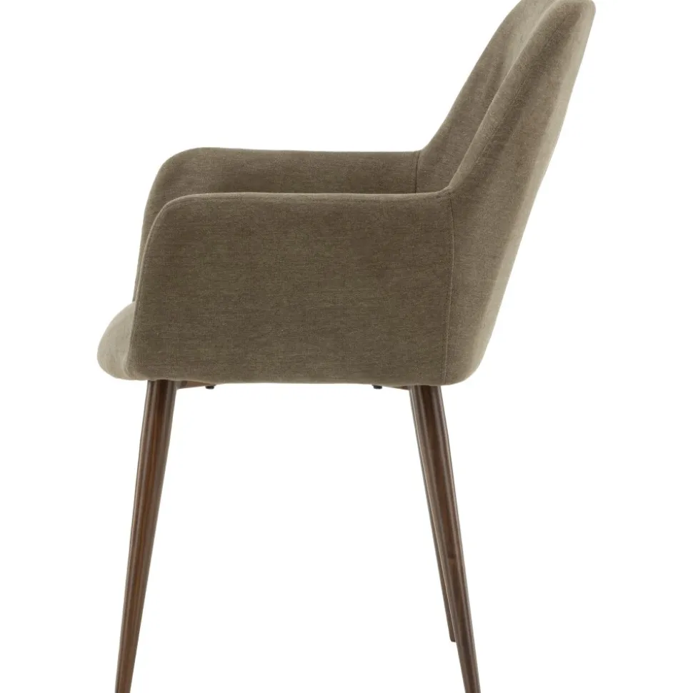 Bekväm matstol med helklädd sits och integrerade armstöd i brunt polyestertyg. Stolen har lätt utsvängda stolsben i en modern valnötsbrun kulör. Skapa en inbjudande och charmig atmosfär som känns hemtrevlig och familjär!