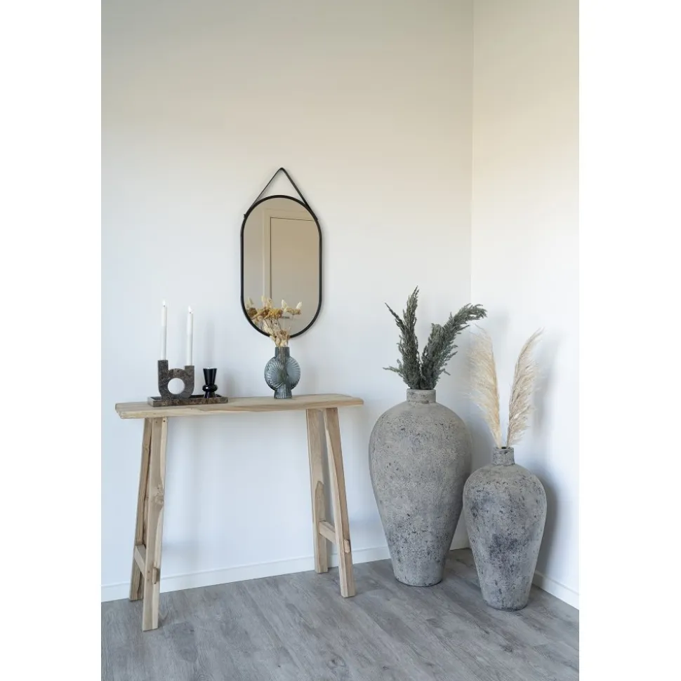 Spegel av stål med upphängning av konstläder.