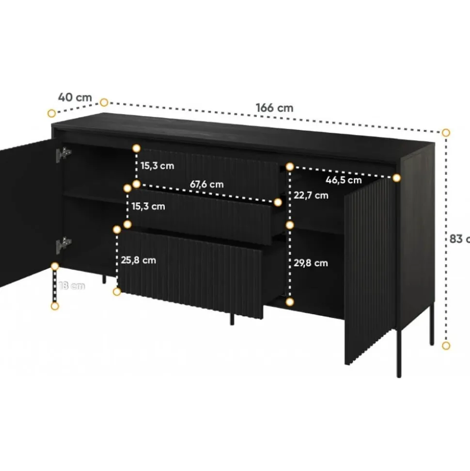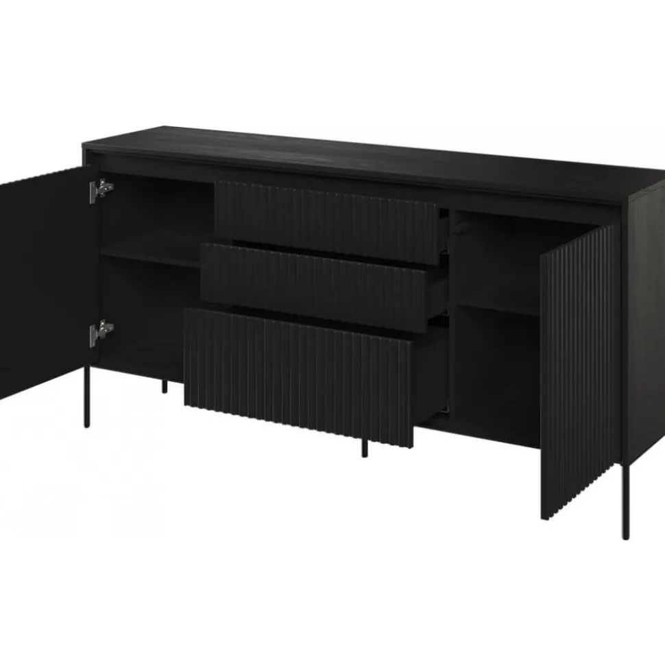 Skänk av laminerad spånskiva med LED-belysning och ben av metall. Levereras omonterad.