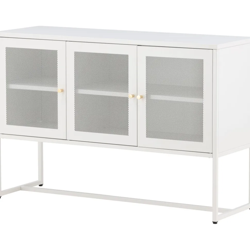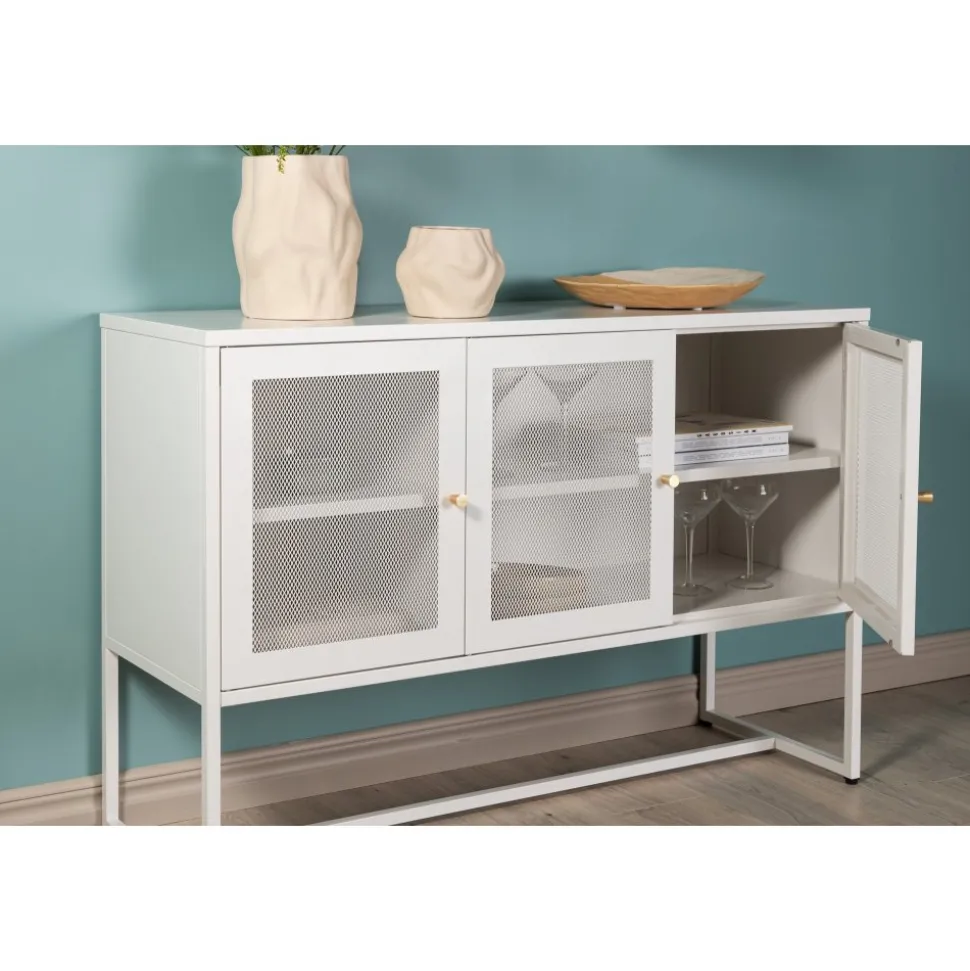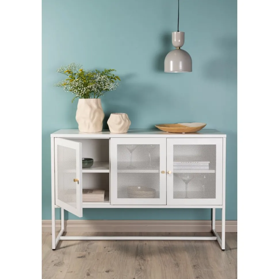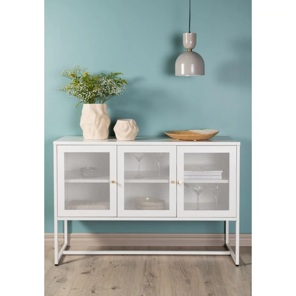 Trerike – ett modernt skåp i en tuff industriell design med läckra nätdörrar och ben tillverkade i vit pulverlackerad stål med 2 smarta hyllplan för avlastning. Skåpet lyfts upp av smala, höga ben som skapar en luftig känsla och underlättar även för dammsugaren. Den perfekta förvaringsmöbeln för allt du önskar – fyll med porslin, böcker eller vackra dekorationer. Skåpets smidiga storlek och eleganta utsida gör den lättplacerad och passar bra in i de flesta rum i hemmet, så möblera efter egna behov och önskemål.