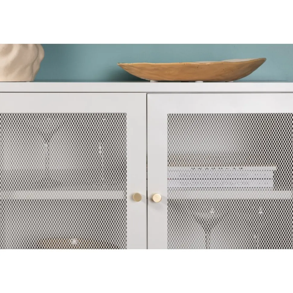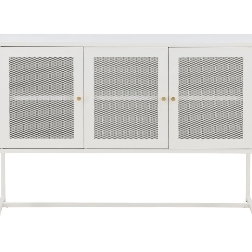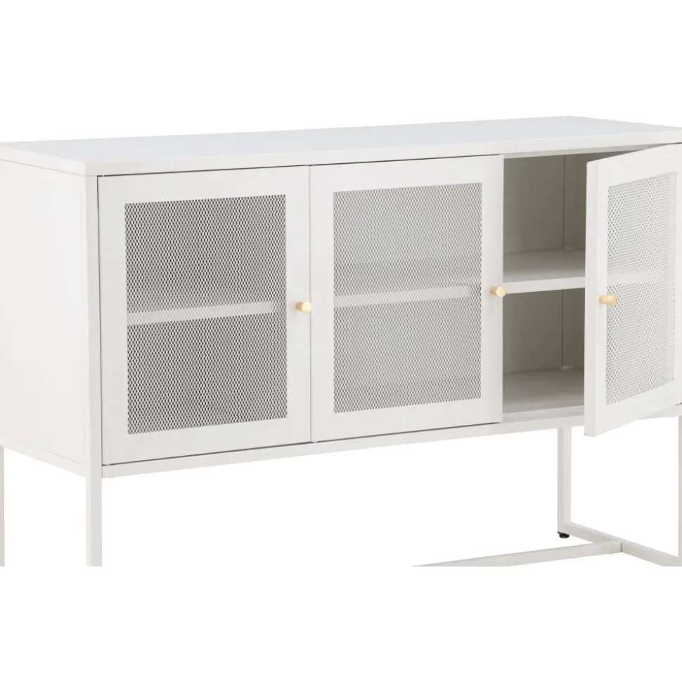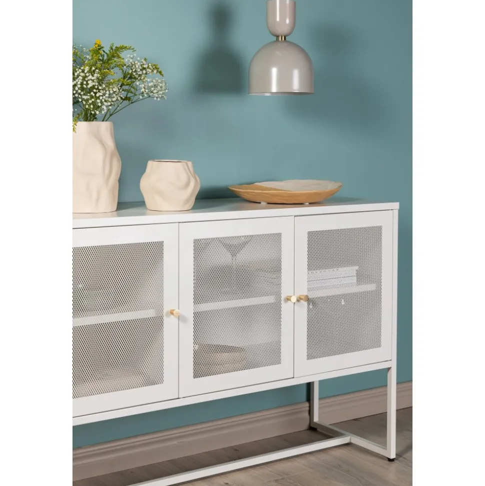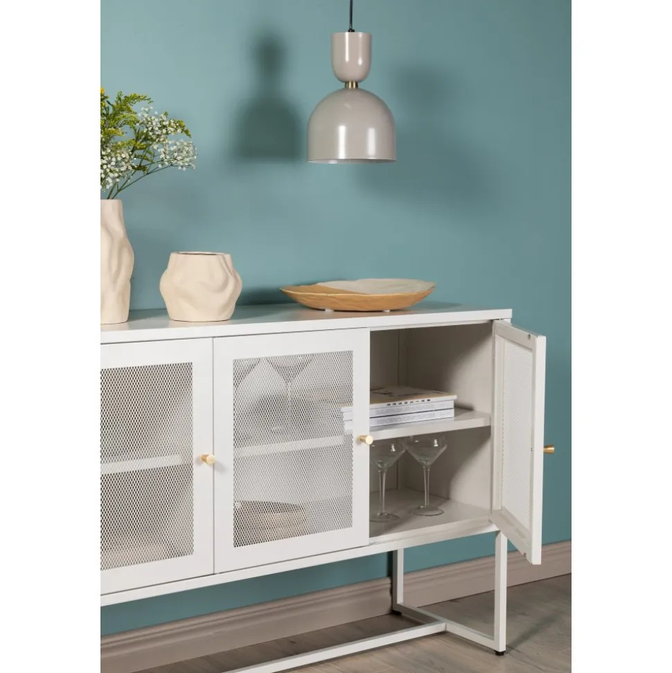 Trerike – ett modernt skåp i en tuff industriell design med läckra nätdörrar och ben tillverkade i vit pulverlackerad stål med 2 smarta hyllplan för avlastning. Skåpet lyfts upp av smala, höga ben som skapar en luftig känsla och underlättar även för dammsugaren. Den perfekta förvaringsmöbeln för allt du önskar – fyll med porslin, böcker eller vackra dekorationer. Skåpets smidiga storlek och eleganta utsida gör den lättplacerad och passar bra in i de flesta rum i hemmet, så möblera efter egna behov och önskemål.