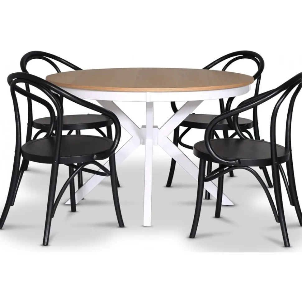 Tromsö från Skånska Möbelhuset, runt matbord 120 cm i diameter med vitt underrede och en toppskiva i oljad ekfanèr. Det ingår fyra stycken matchande Danderyd karmstolar i svartlackat trä.