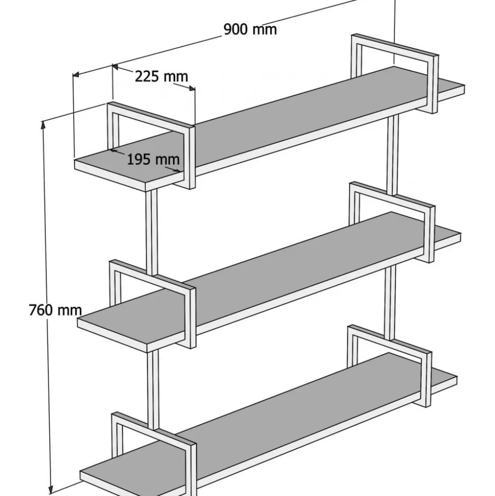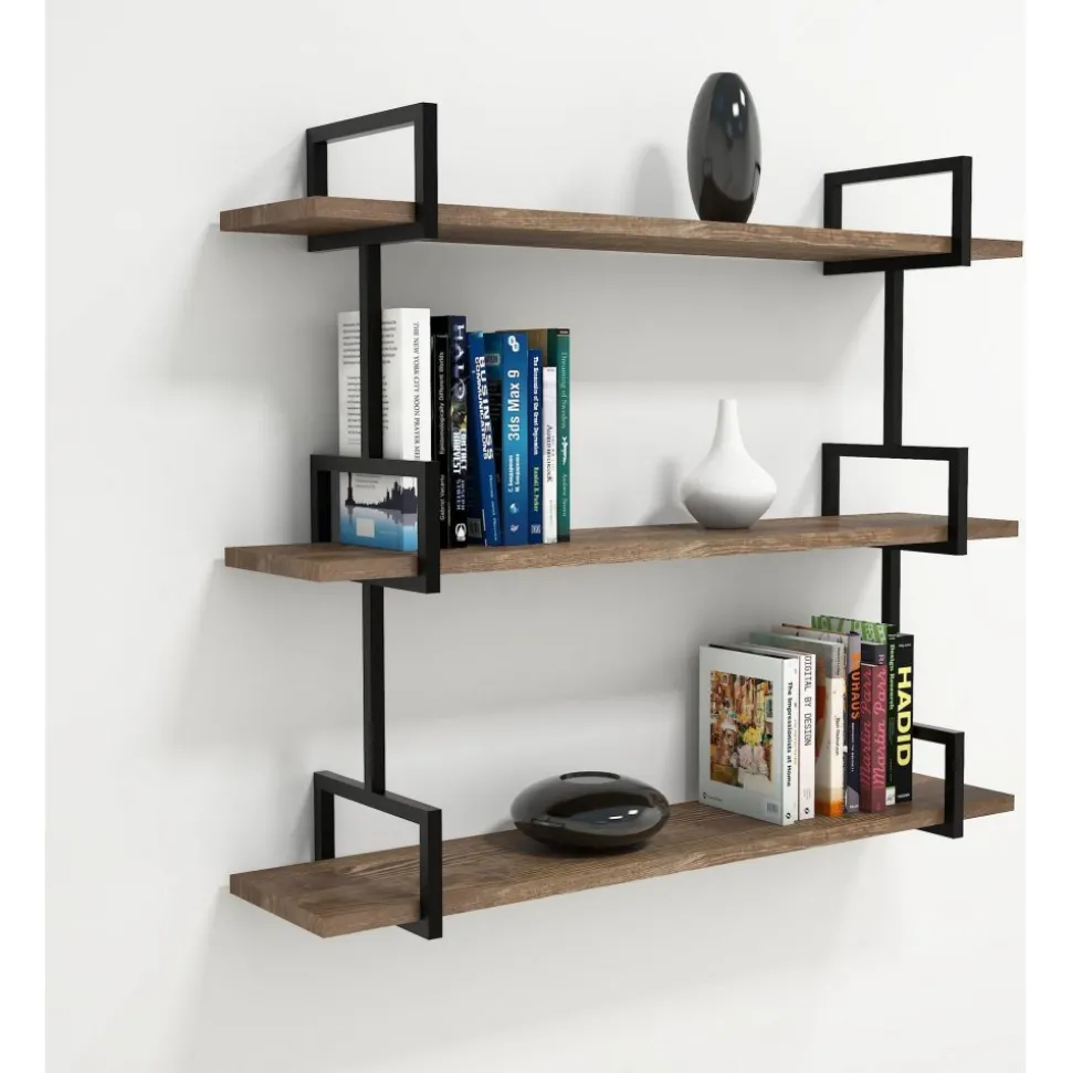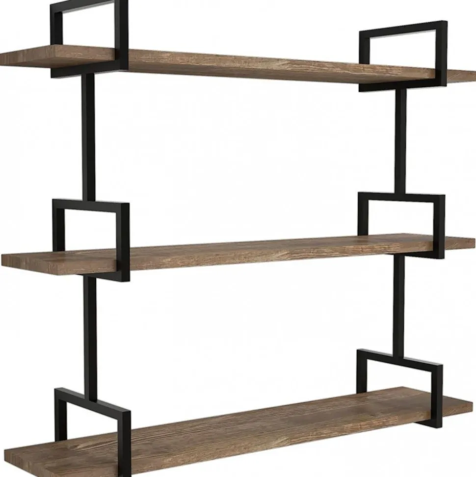 Vägghylla av trä och metall.