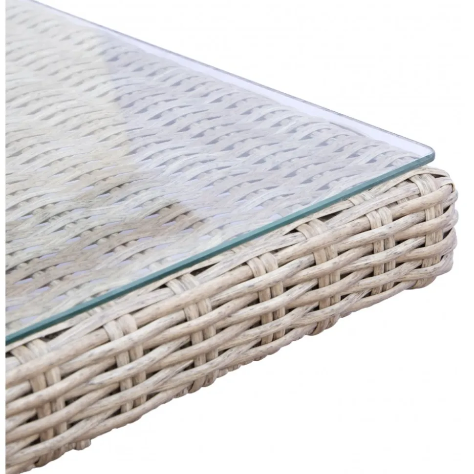 Hampton matbord i naturfärgad konstrotting 200×100 cm. Stomme i aluminium som är klädd med halvrund och rund naturfärgad konstrotting. Toppskiva av tempererat glas.