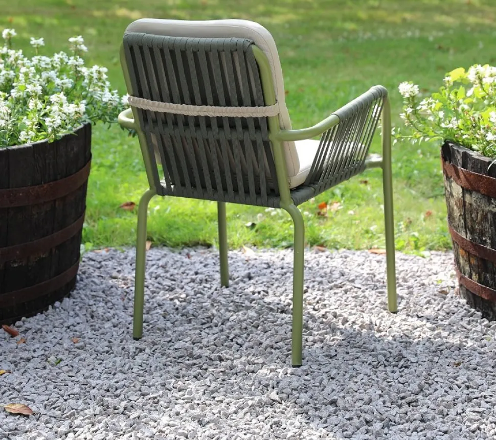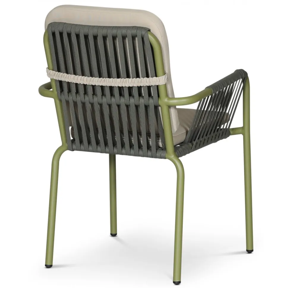 Lincoln-stolen är både snygg och praktisk perfekta valet för uteplatsen! Den har en grön aluminiumstomme som är både lätt och tålig, så du kan enkelt flytta runt den efter behov. Sitsen i rep ger en modern och luftig känsla samtidigt som den släpper igenom luft, vilket är skönt under varma sommardagar. De mjuka, beige dynorna på både sits och rygg gör stolen extra bekväm perfekt för långa middagar eller en lugn stund i solen.