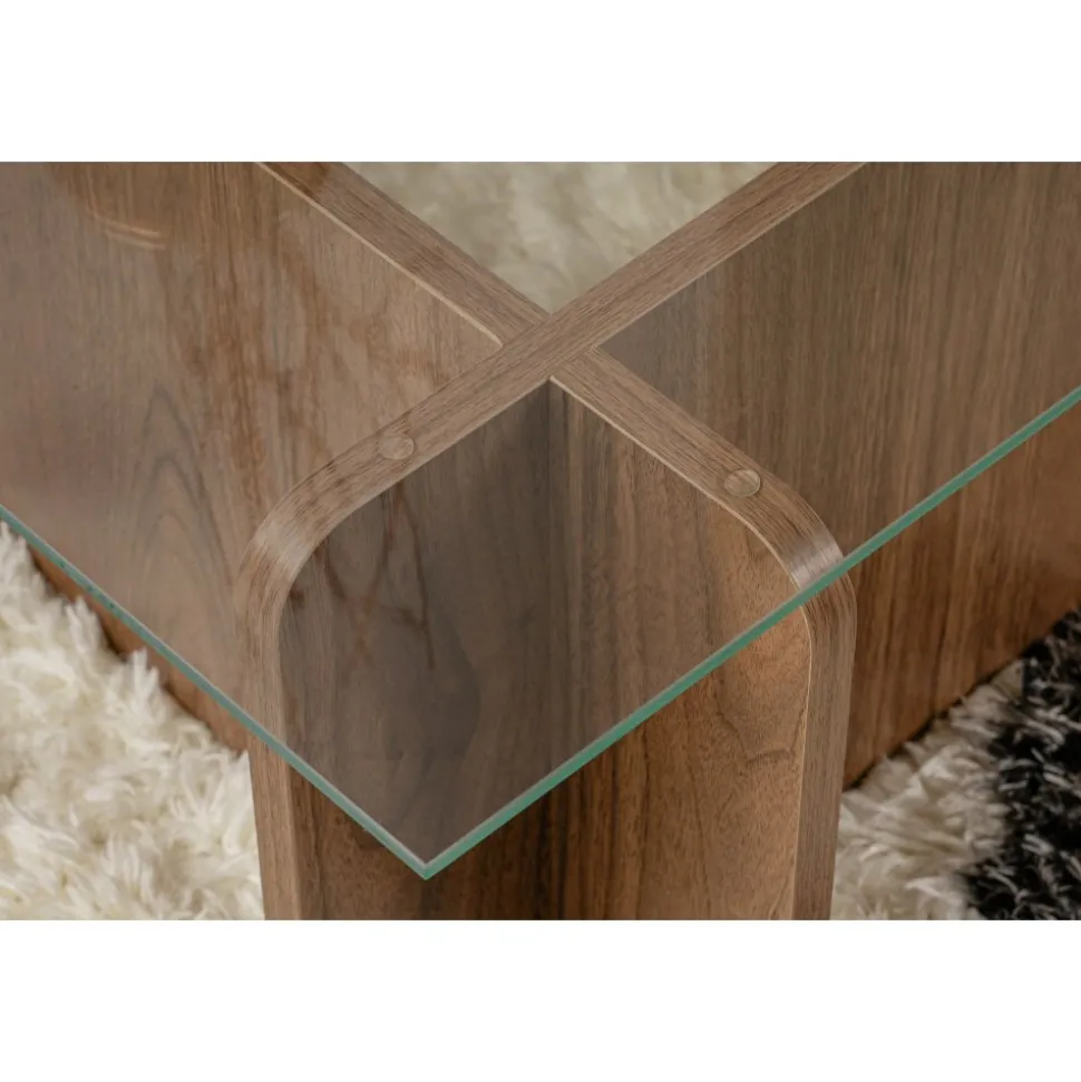 Soffbord av melaminbelagd spånskiva med bordsskiva av tempererat glas.
