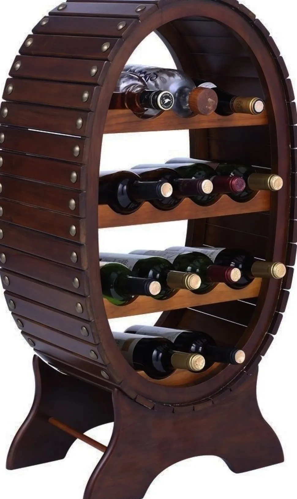 Vinställ i oval form, tillverkat av MDF i brunt utförande. Ett dekorativt med plats för en mindre vinsamling.