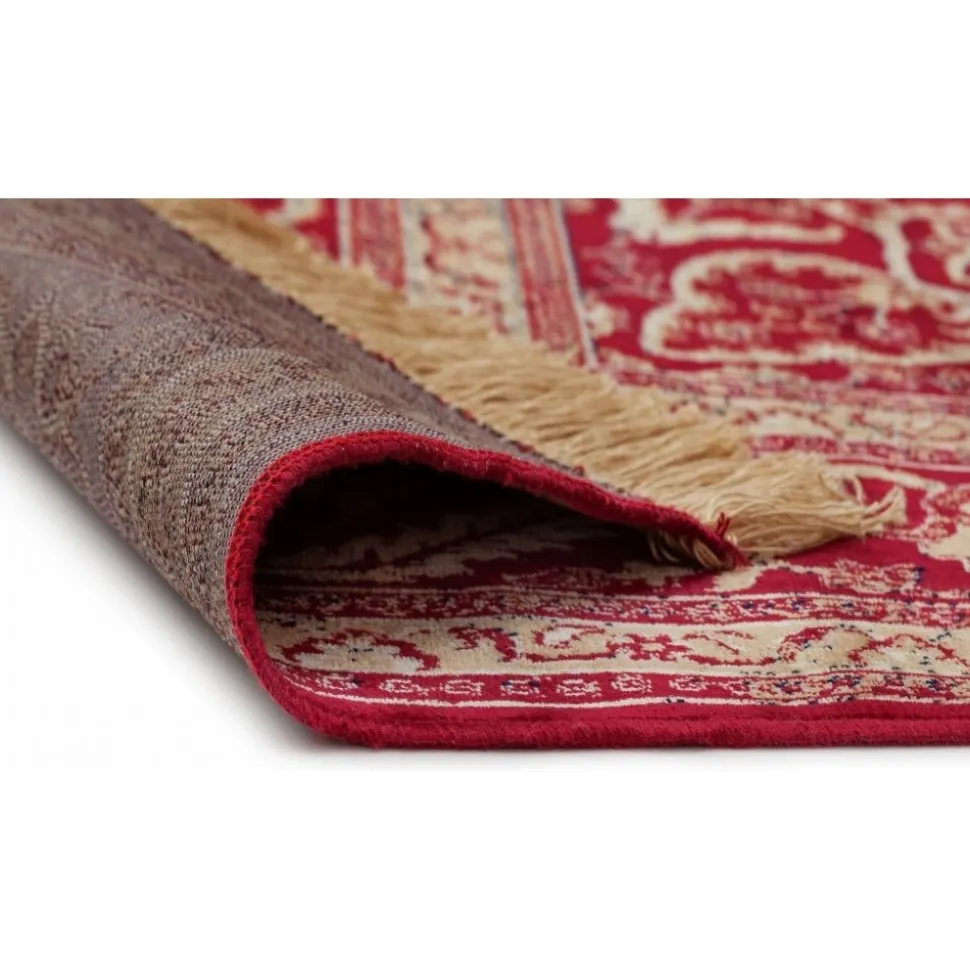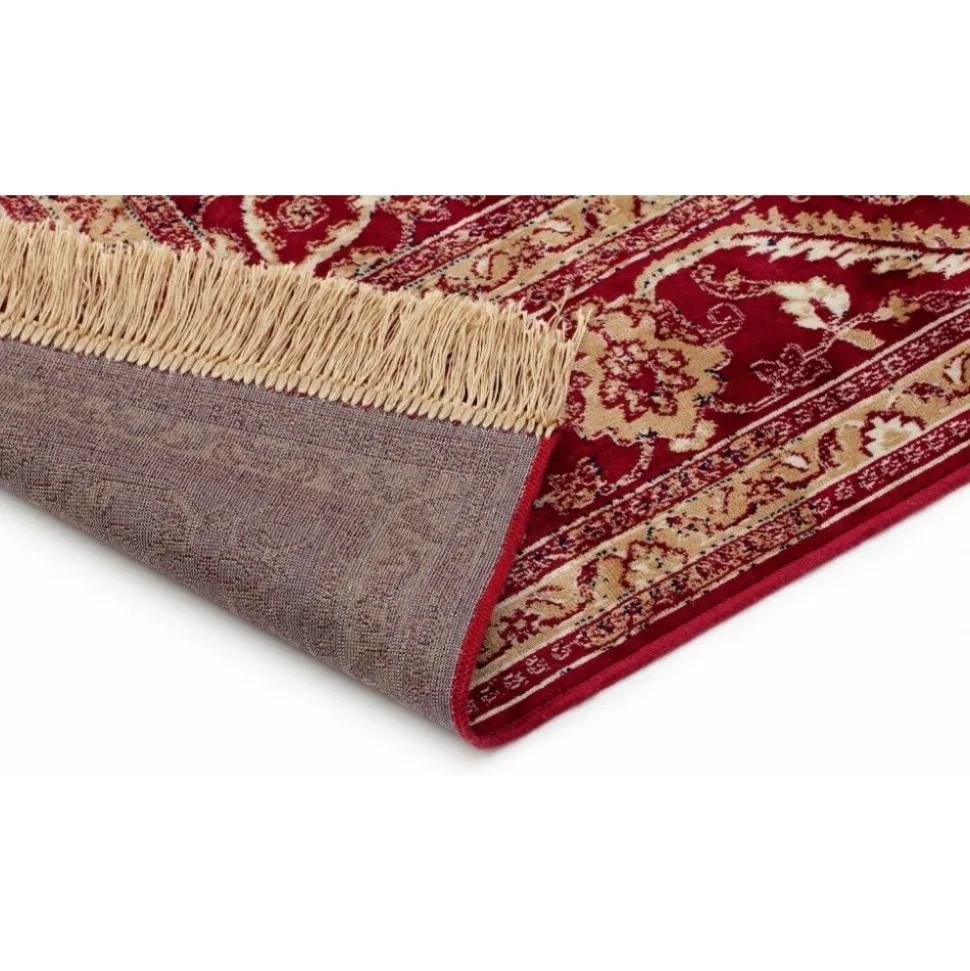 Casablanca Kashan har en röd bottenfärg med matchande langettering och vita fransar på kortändarna. Mattan har ett klassiskt orientaliskt mönster som går i beige, grå och vita toner.