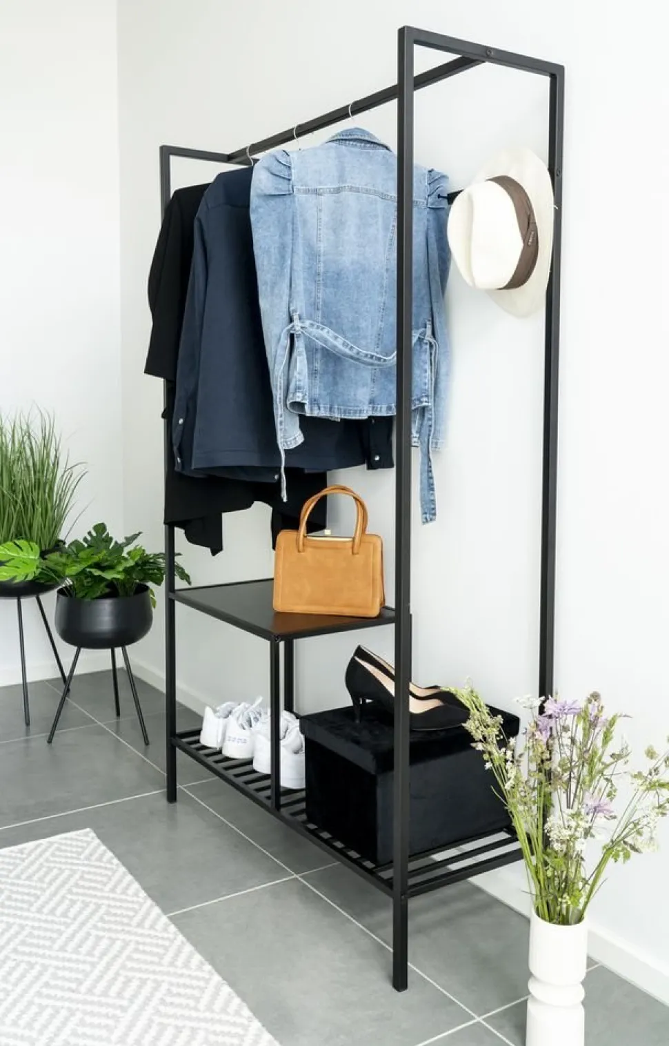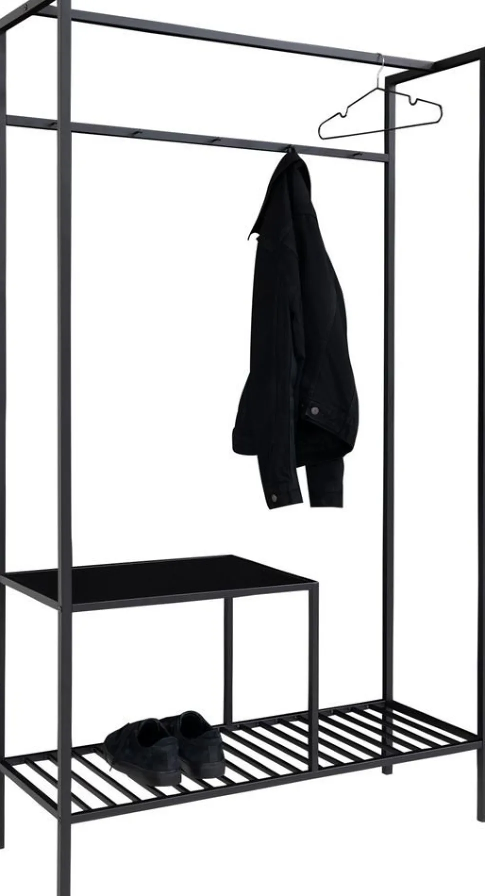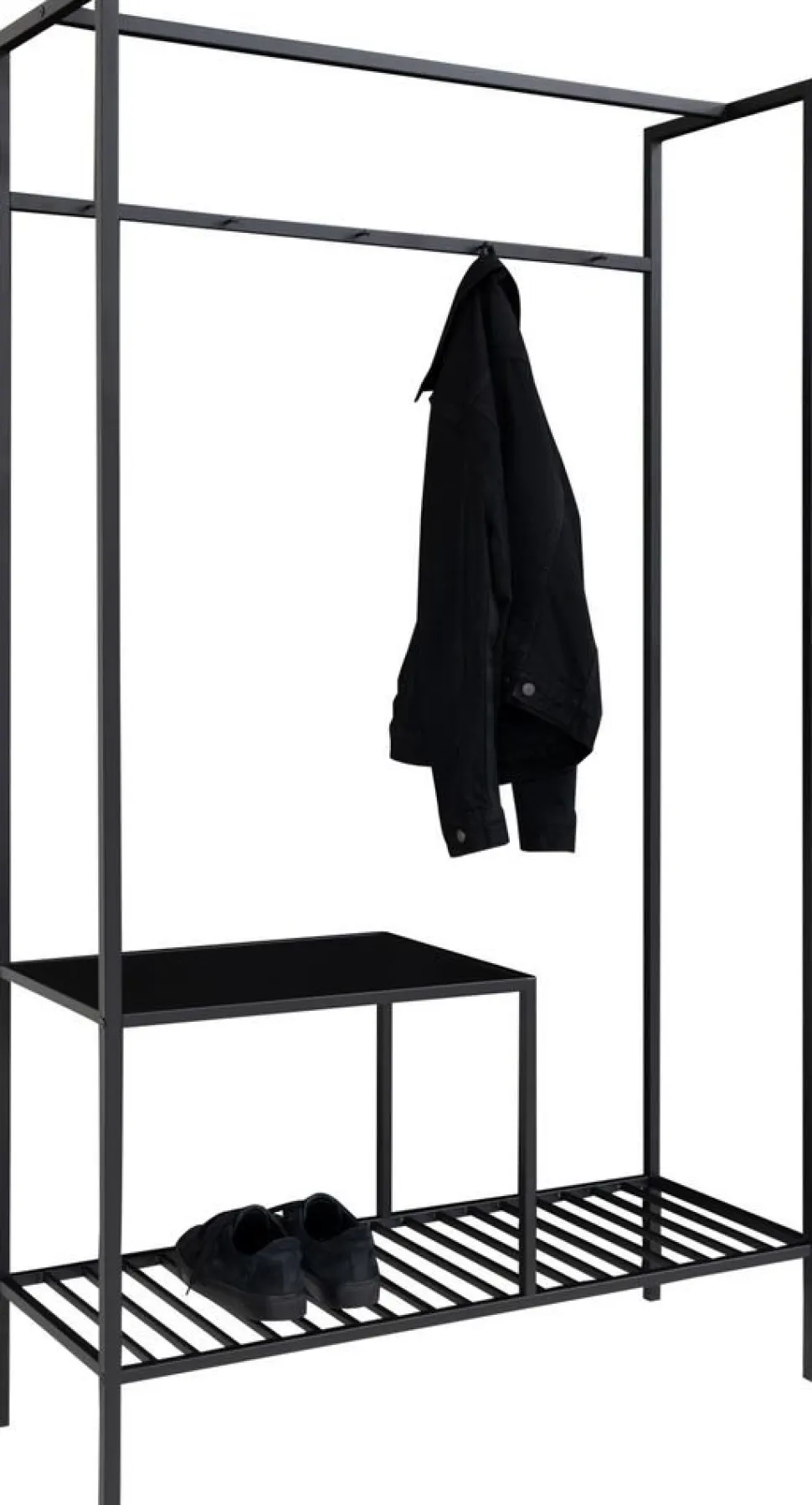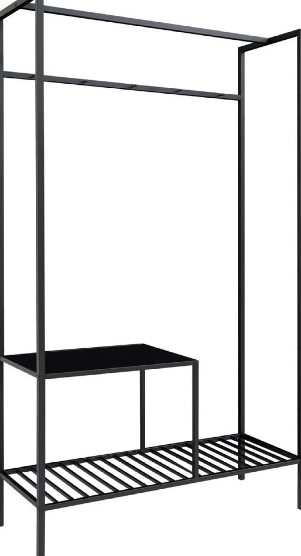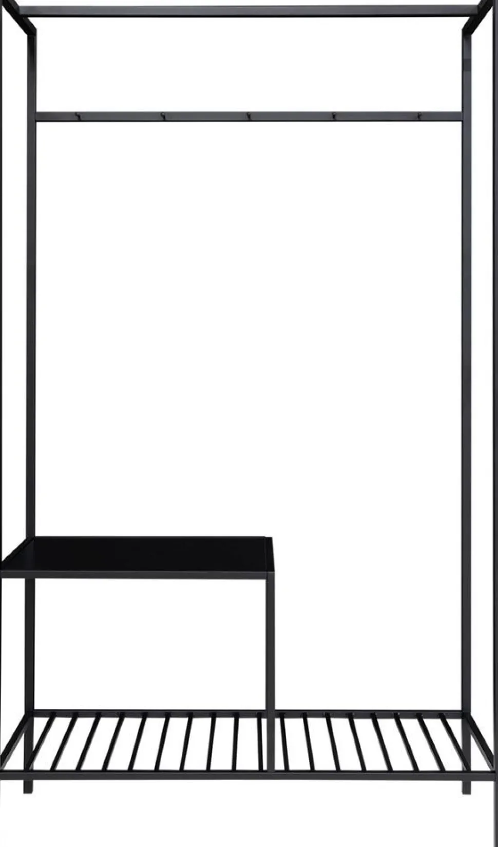 Klädhängare i svart med hyllor.