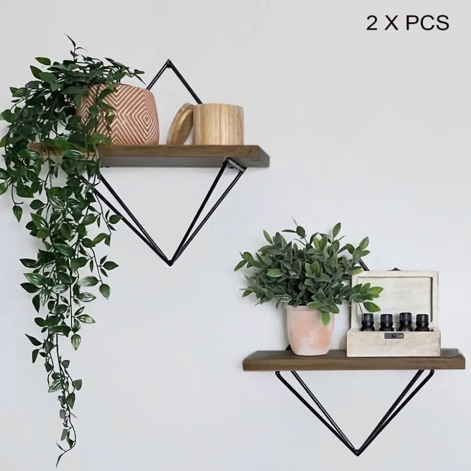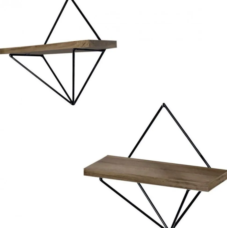 Vägghylla av trä och metall.